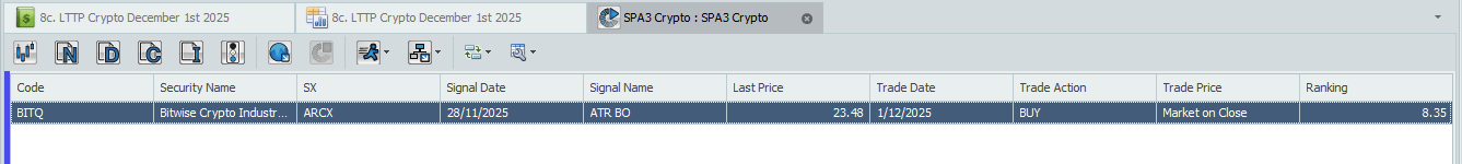 The December Crypto LTTP portfolio kicked off with it’s first trade to execute after BITQ generated BUY signal at the close of the last market session.